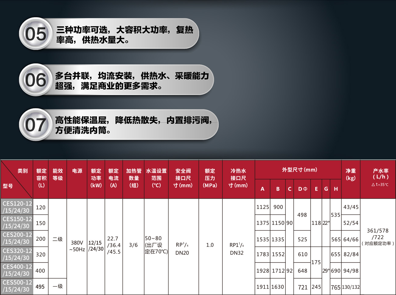 ·大容积大功率,复热率高,供热水量大